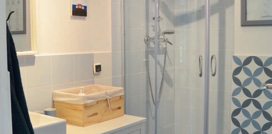 Kabina prysznicowa była zdecydowanie do wymiany! Wysoki brodzik z siedziskiem stracił swoją świeżość, zarówno z tytułu wieloletniej eksploatacji, jak i swojej niemodnej już formy. Chropowate drzwi kabiny z plastiku były trudne do czyszczenia i zabierały optycznie przestrzeń – w efekcie łazienka wydawała się wręcz przywalona ciężką wizualnie kabiną. Zastąpiła ją nowa, z niskim brodzikiem i całkowicie przejrzystymi szklanymi drzwiami. Gospodarze w sezonie również wynajmują dom gościom, dlatego zachowanie czystości jest rzeczą kluczową – drzwi kabiny pokryte są powłoką hydrofilną.